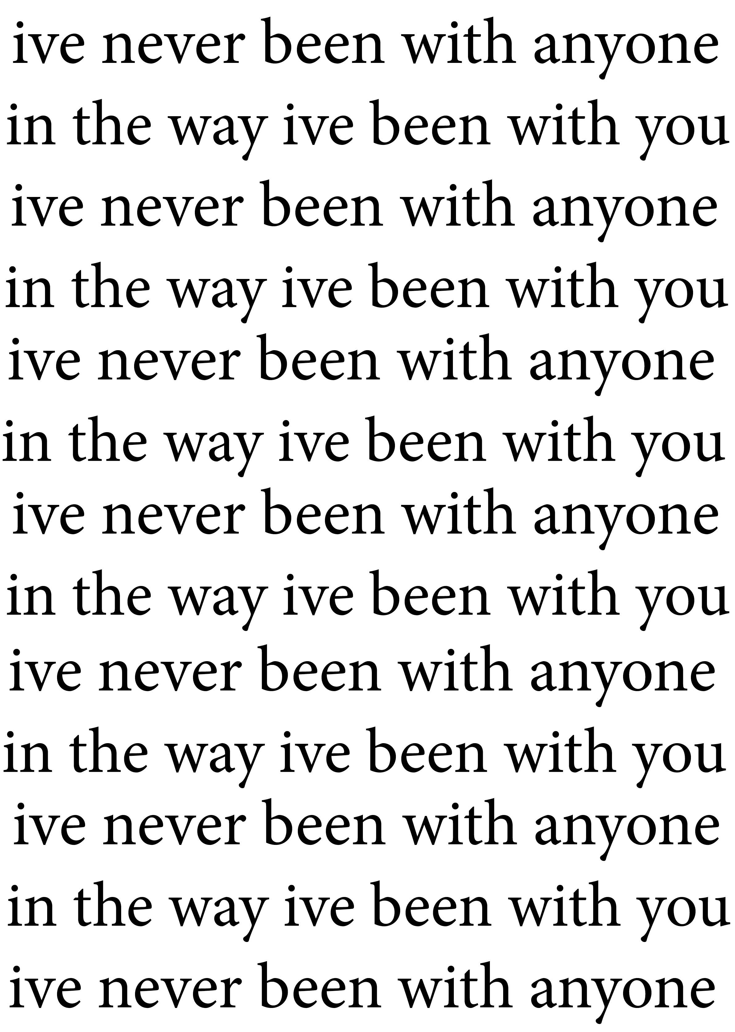 Ik heb deze poster gemaakt voor een studentenchallenge van Graphic Matters. De opdracht was om een poster te ontwerpen met een quote of tekst waarin de letters centraal staan. Het eindresultaat is een A0-poster. Ik heb gekozen voor de tekst ‘I’ve never been with anyone, in the way I’ve been with you’ uit het nummer I Don’t Wanna Change You van Damien Rice, omdat deze tekst mij persoonlijk erg aanspreekt. Ik heb ervoor gekozen om er een typografische poster van te maken, zodat de focus volledig op de tekst ligt.