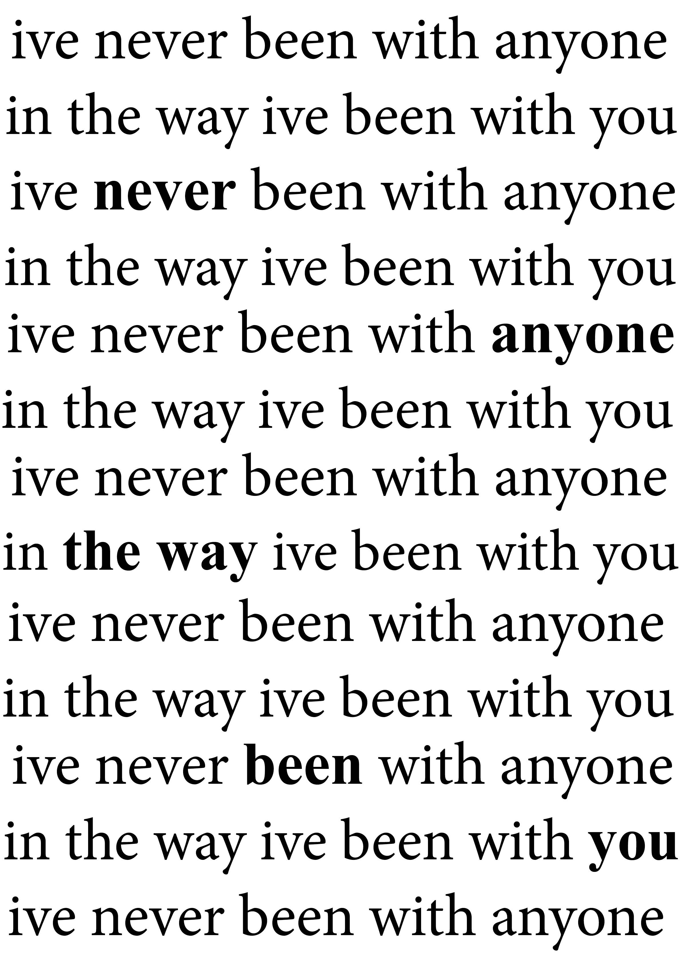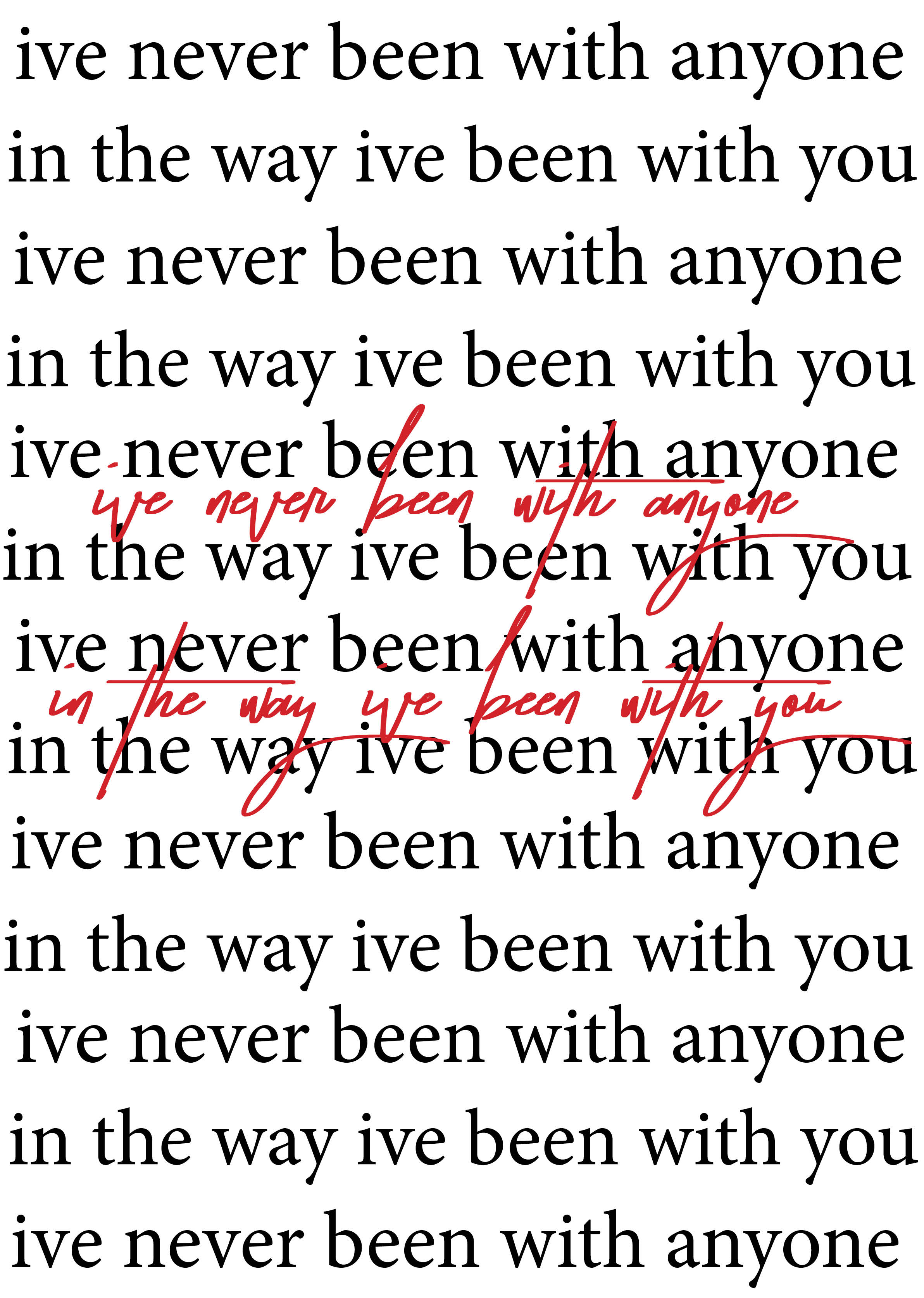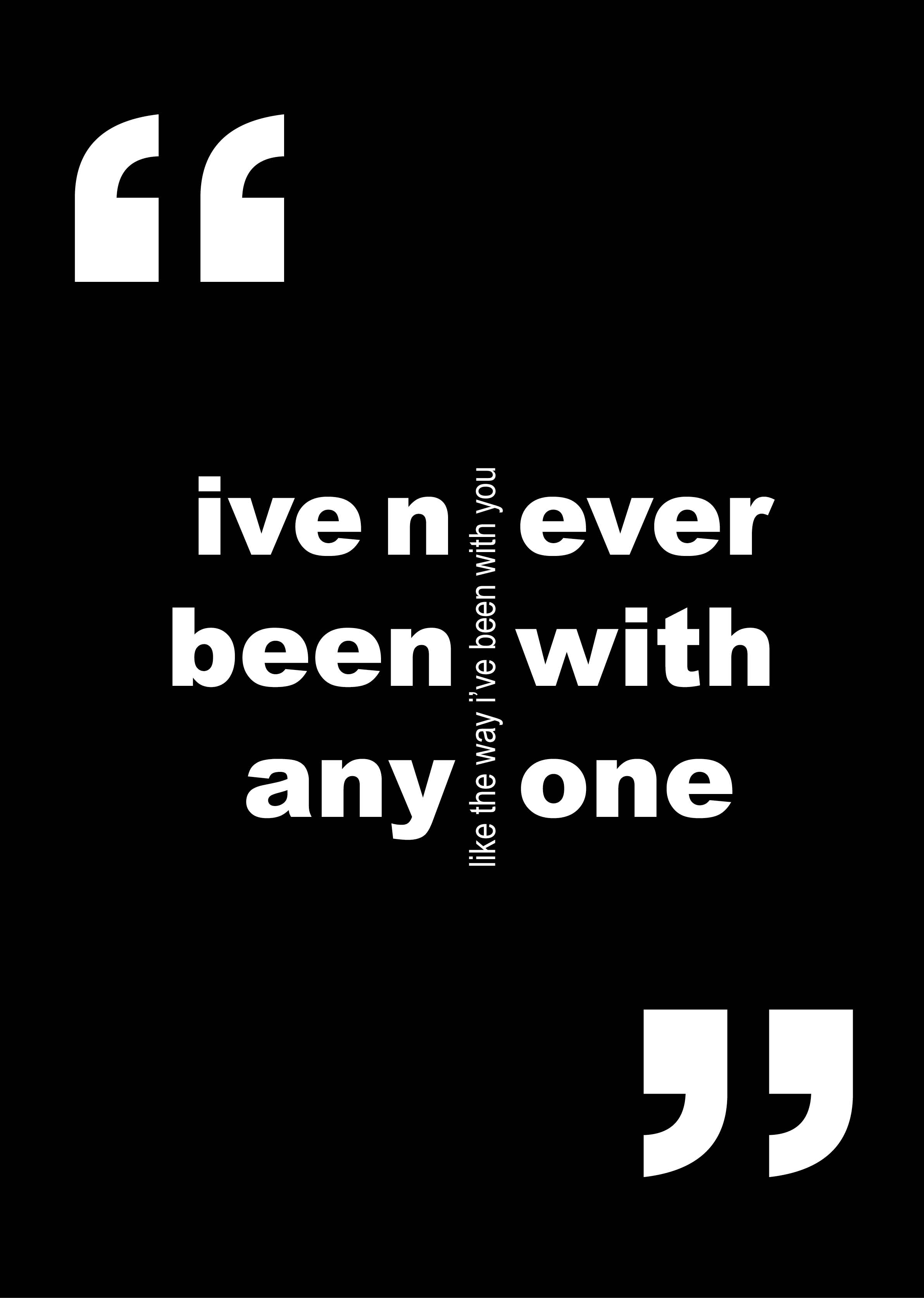 Ik heb deze poster gemaakt voor een studentenchallenge van Graphic Matters. De opdracht was om een poster te ontwerpen met een quote of tekst waarin de letters centraal staan. Het eindresultaat is een A0-poster. Ik heb gekozen voor de tekst ‘I’ve never been with anyone, in the way I’ve been with you’ uit het nummer I Don’t Wanna Change You van Damien Rice, omdat deze tekst mij persoonlijk erg aanspreekt. Ik heb ervoor gekozen om er een typografische poster van te maken, zodat de focus volledig op de tekst ligt.